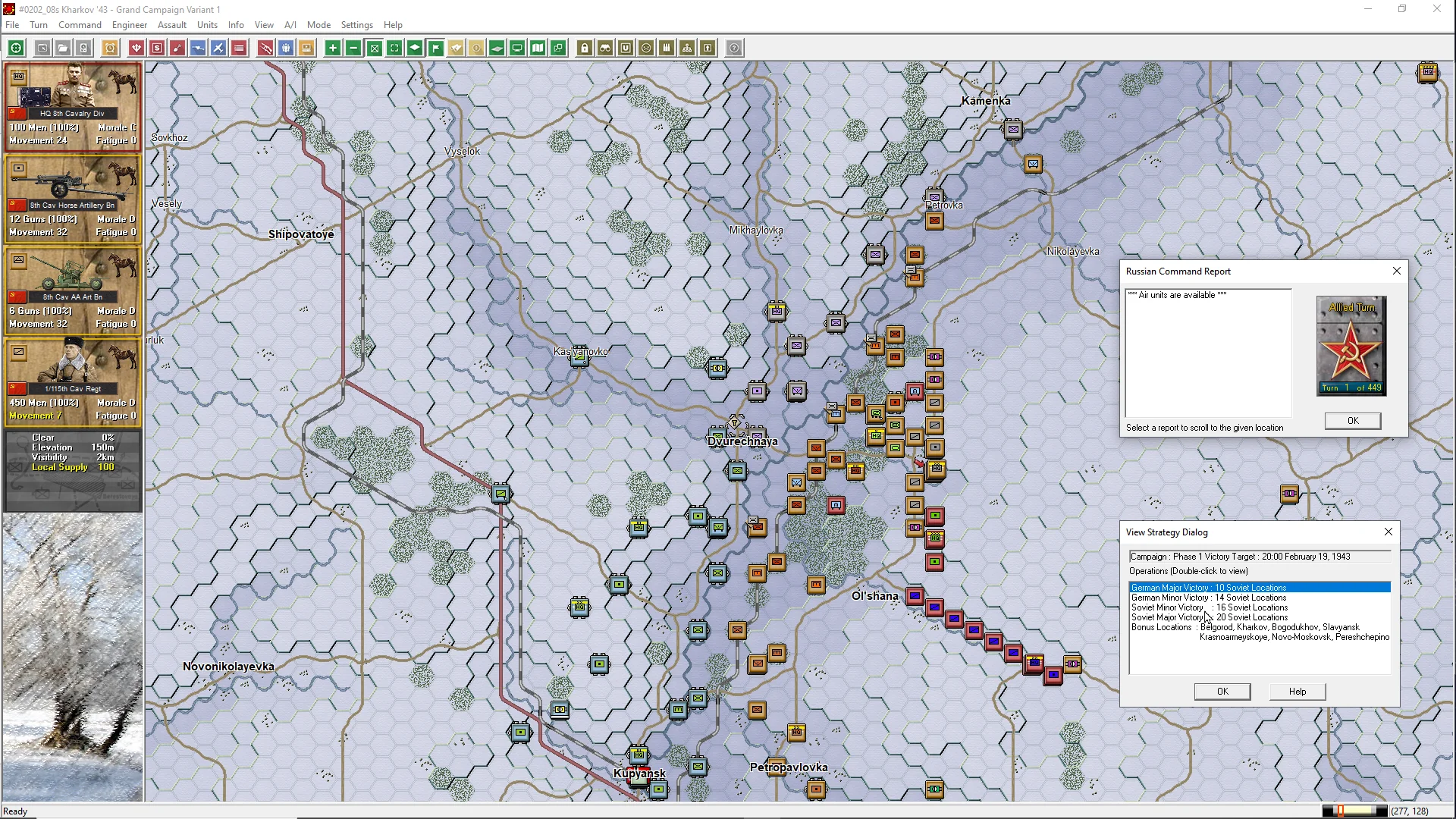 So successful was Manstein's offensive that the Soviets were driven back beyond their starting lines and the front was in hiatus for three months till Kursk. Join the swirling battles in the Ukraine from the desperate defense at Kharkov to the open steppes in the Donbas as the two protagonists fought in deep snow and mud. Can you deliver the death blow to Germany or will you celebrate the last victory in Russia?