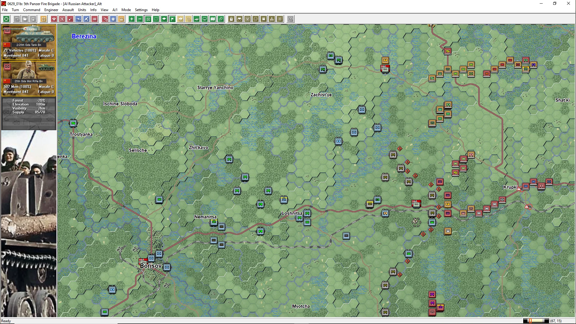 In June of 1944 Adolf Hitler was expecting the coming Soviet summer offensive to be launched against the German front line south of the Pripet Marshes. Instead, Stalin unleashed a massive attack on the very cornerstone of the German Army--Army Group Center which held a massive salient to the north. This was Operation BAGRATION, an all-out offensive to crush Army Group Center, concentrating armor, artillery and aircraft. The Red Army quickly broke through the thinly held German lines and encircled the fortified cities of Vitebsk, Orsha, Mogilev, and Bobruysk. Then the Soviet tank and mechanized formations swept on westwards towards the very heart of the Third Reich. Taken by surprise, the majority of the German Fourth and Ninth Armies were trapped between Minsk and the Berezina River. It was a catastrophic defeat, destroying 28 of 34 German divisions from Army Group Center's order of battle. So complete was the Soviet victory that five weeks later the Red Army was on the banks of the Vistula River and the borders of East Prussia.