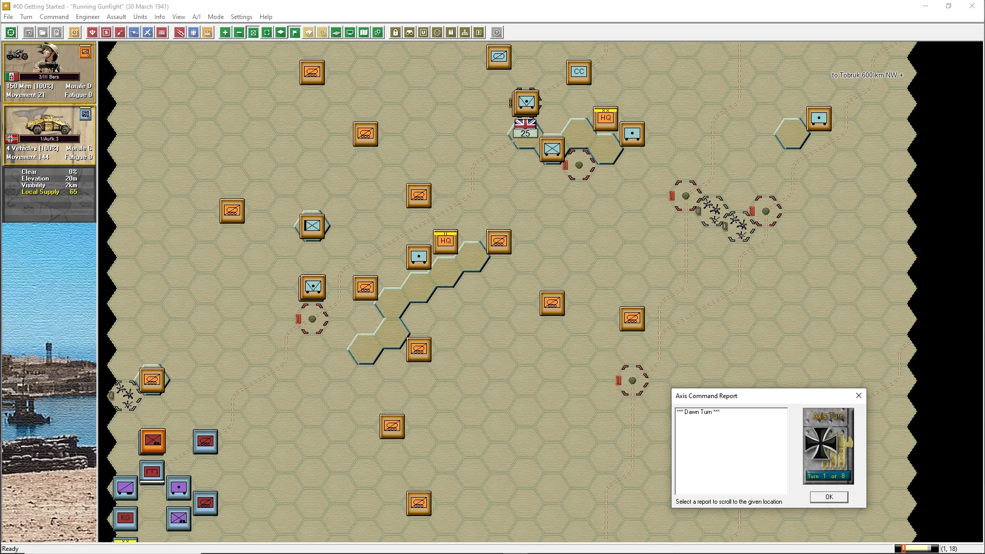 Following the British defeat of the Italians in 1940, Rommel would arrive with the lead elements of the infamous Afrika Korps. Tobruk '41 is an operational level simulation that traces the North African desert campaigns with scenarios covering action from Mersa Brega in March '41, and finishing at the end of Crusader in December. In 1940, the British had little trouble pushing the Italian army in Libya away from the Egyptian border. However early the next year, General Rommel arrived in North Africa and quickly took the offensive. While the British garrison at Tobruk held on, desperate battles were fought across the desert sands. Will the British be able to relieve Tobruk, or will Rommel earn another victory resulting in his standing as the Desert Fox?